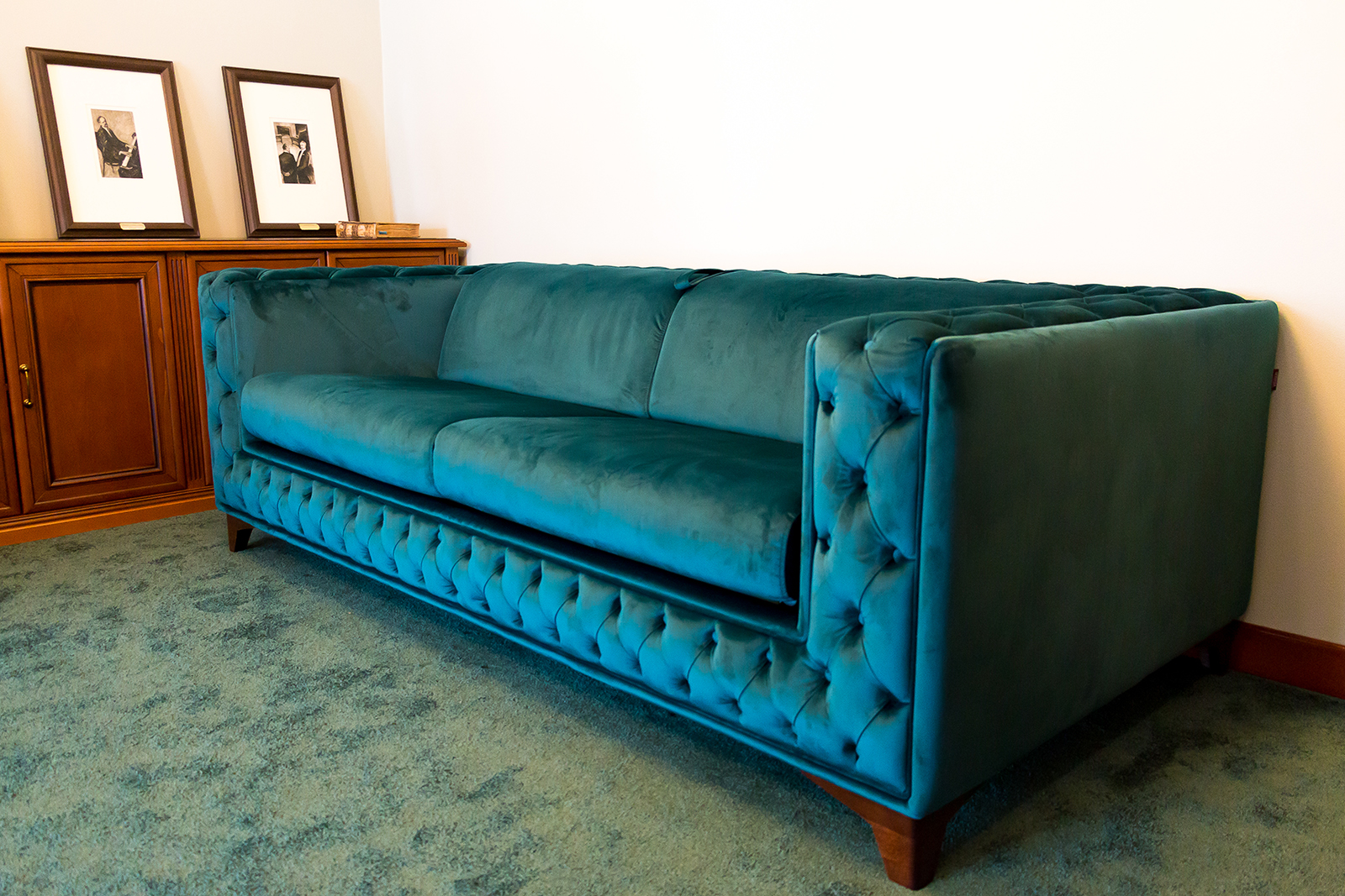 Вот такой прекрасный диван стал частью проекта в гостинице "Боровница". Итальянский дизайнер коллекции Veleggio - Томмазо Олива создал прекрасную коллекцию в стиле «классик нуово». Ему удалось осуществить новое прочтение классики и увеличил варианты дизайнерских интерьерных решений. Диваны, созданные итальянскими мебельными мастерами "дышат» духом роскоши и респектабельности. Диван Marsala может быть угловым, прямым или модульным. В данном случае клиенты быбрали прямой вариант. В качестве наполнителя используется 3 марки высокоэластичного пенополиуретана, синтетическое волокно. Несущие элементы каркаса выполнены из натурального дерева. В стационарной спинке размещён дополнительный бокс для белья. Опоры дивана сделаны из натурального дуба. В спинке находится механизм подъёма подголовника. В качестве опций в данной модели доступны: механизм трансформации, чехол для механизма трансформации.