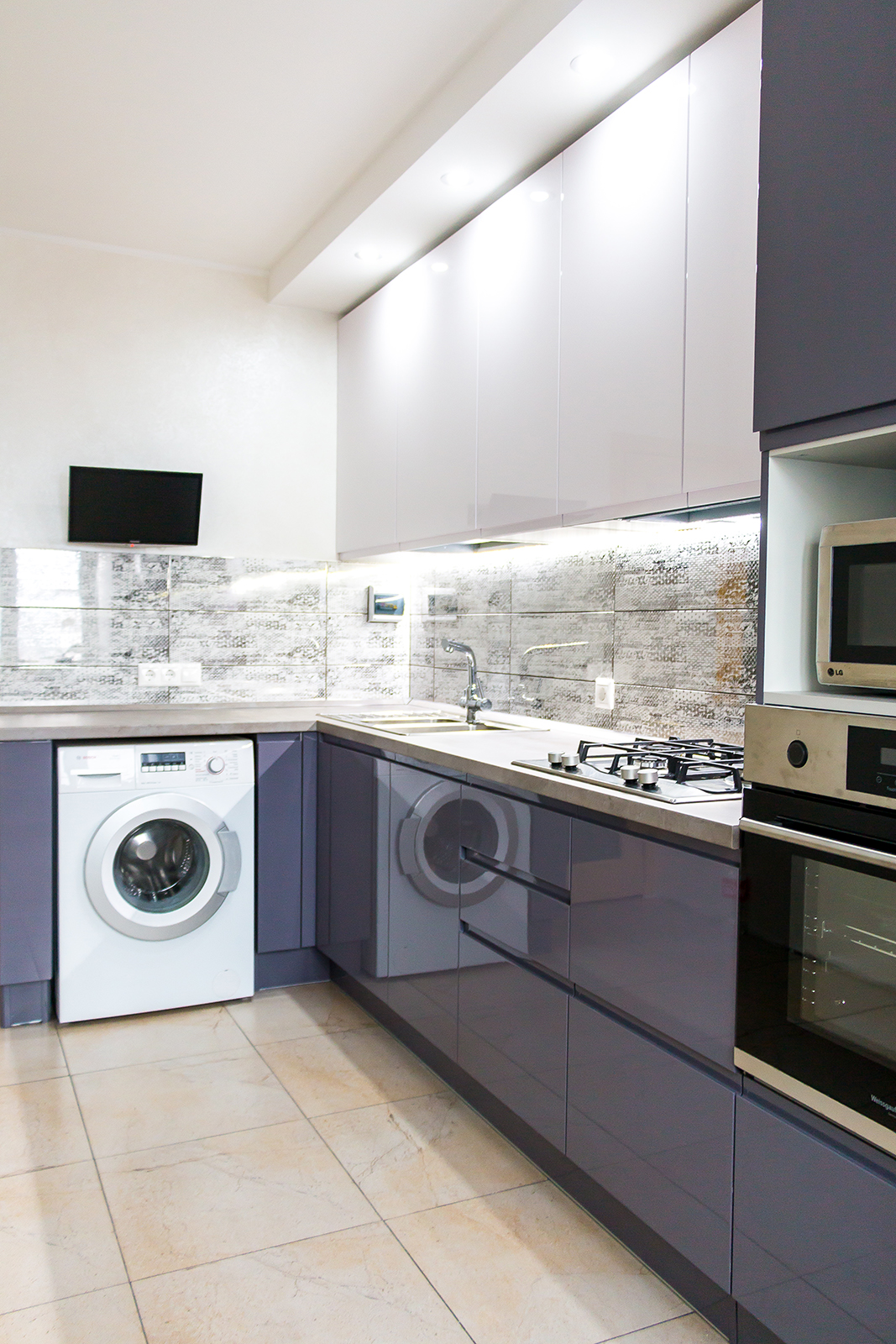Ящик над холодильником снабжён подъёмным механизмом AVENTOS от фирмы BLUM.
