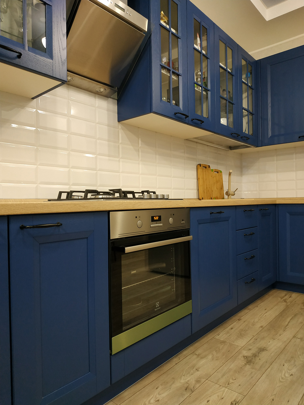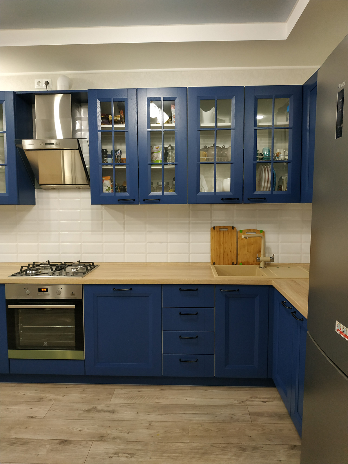 сайту. Нам оставалось облечь мечту в форму. В ходе компоновки появлялся и исчезал винный шкаф под столешницей, кухня растягивалась и сжималась по размерам, что получилось в итоге можно увидеть на фото.