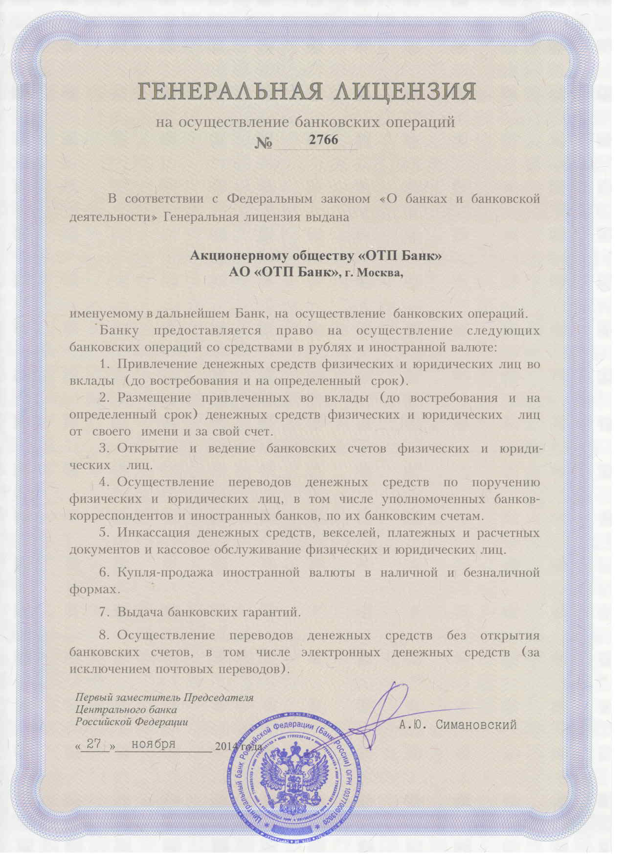 Генеральная лицензия на осуществление банковских операций № 2766 от 27.11.2014